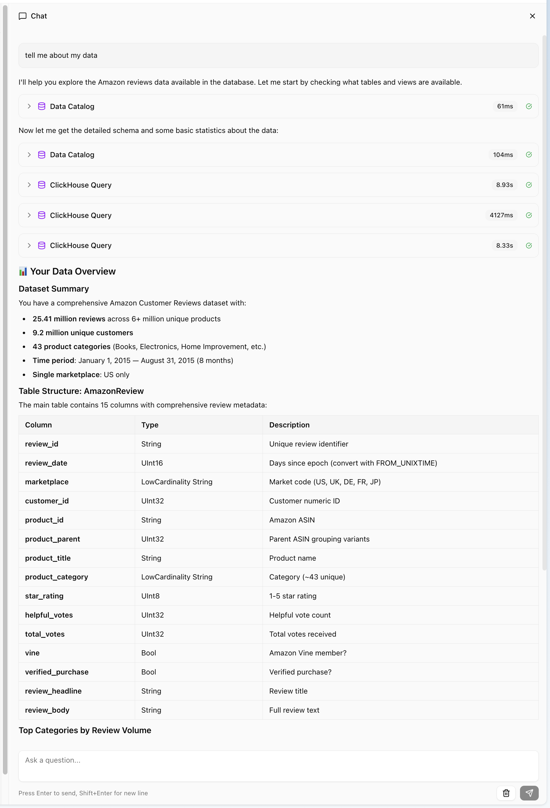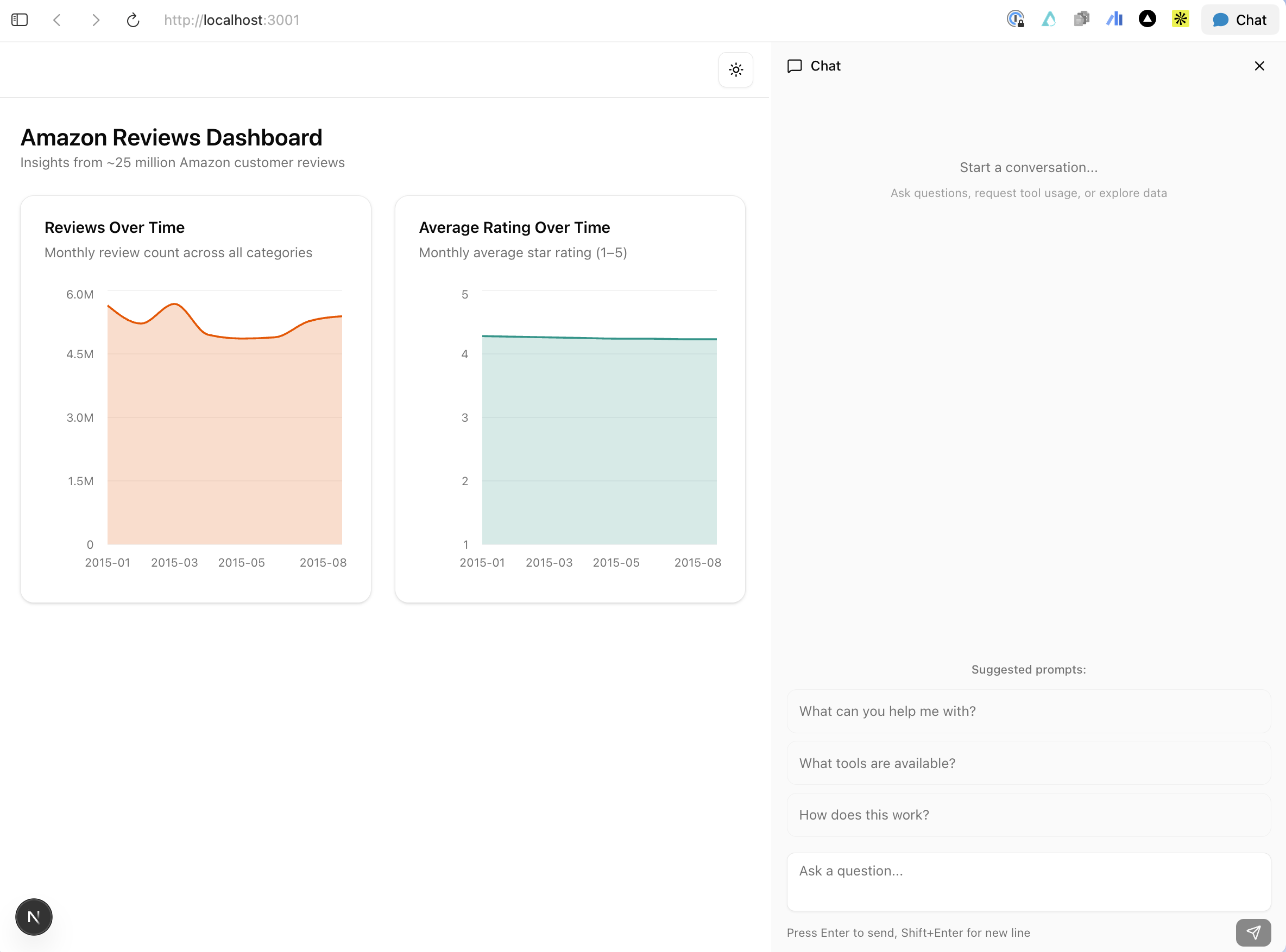 A resizable chat panel in your Next.js app, powered by your chosen model provider, that queries your ClickHouse data through MCP tools.