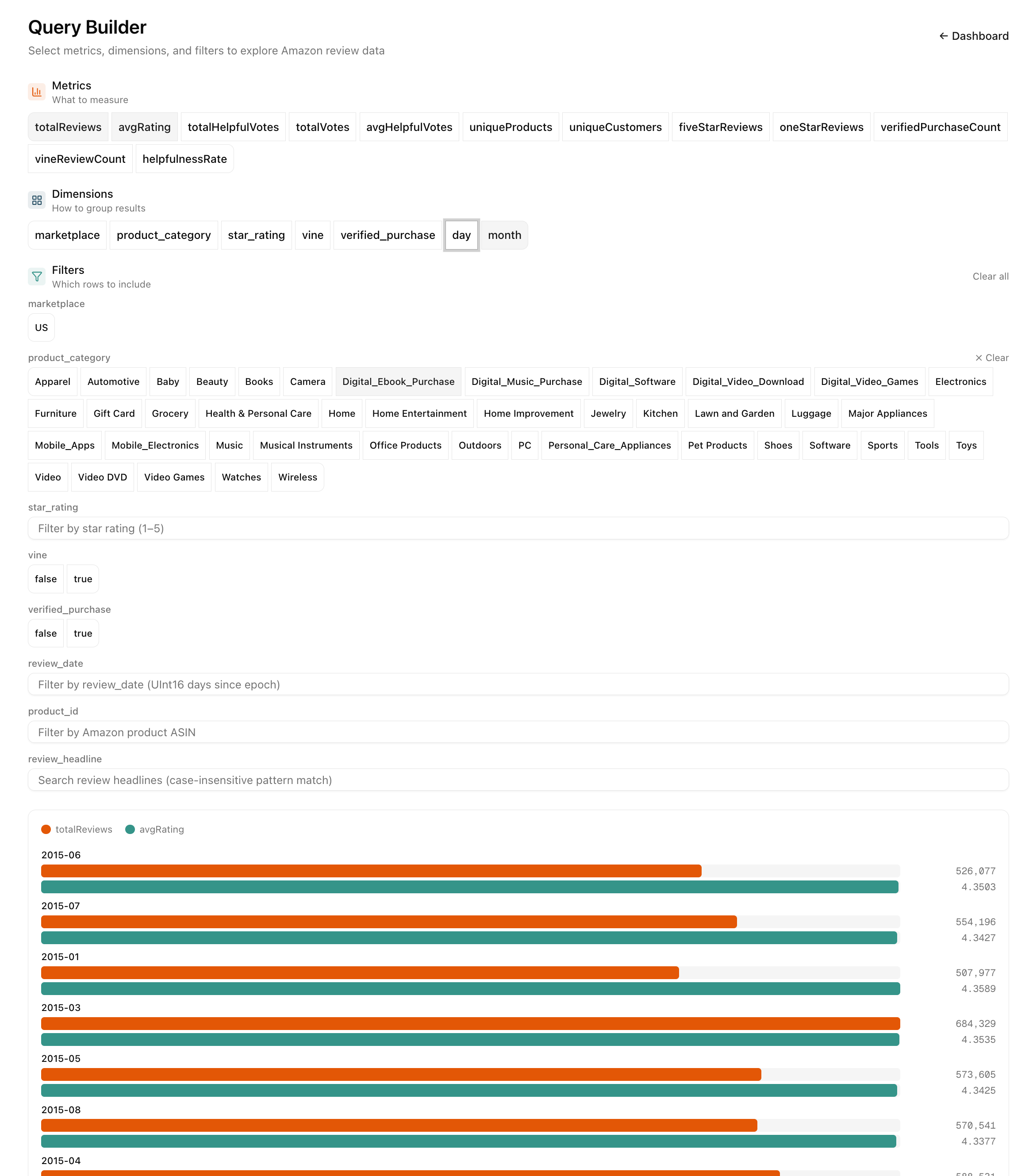 A query builder gives users a point-and-click interface to explore data — select metrics, pick dimensions, apply filters — without writing SQL or relying on an LLM. Because it reads directly from your query model's metadata, any metric or dimension you add to your defineQueryModel automatically appears as an option in the UI. One definition, every surface.