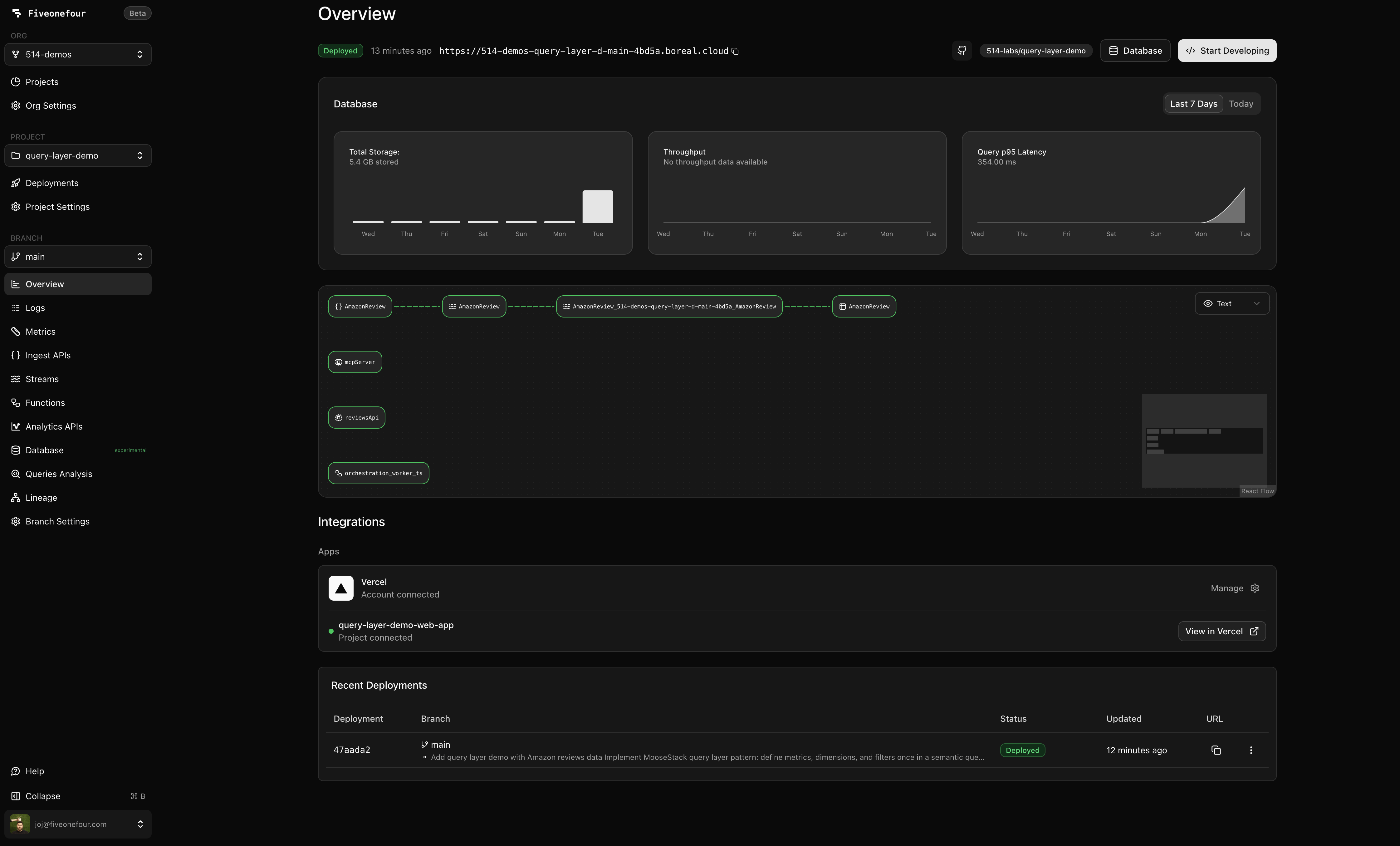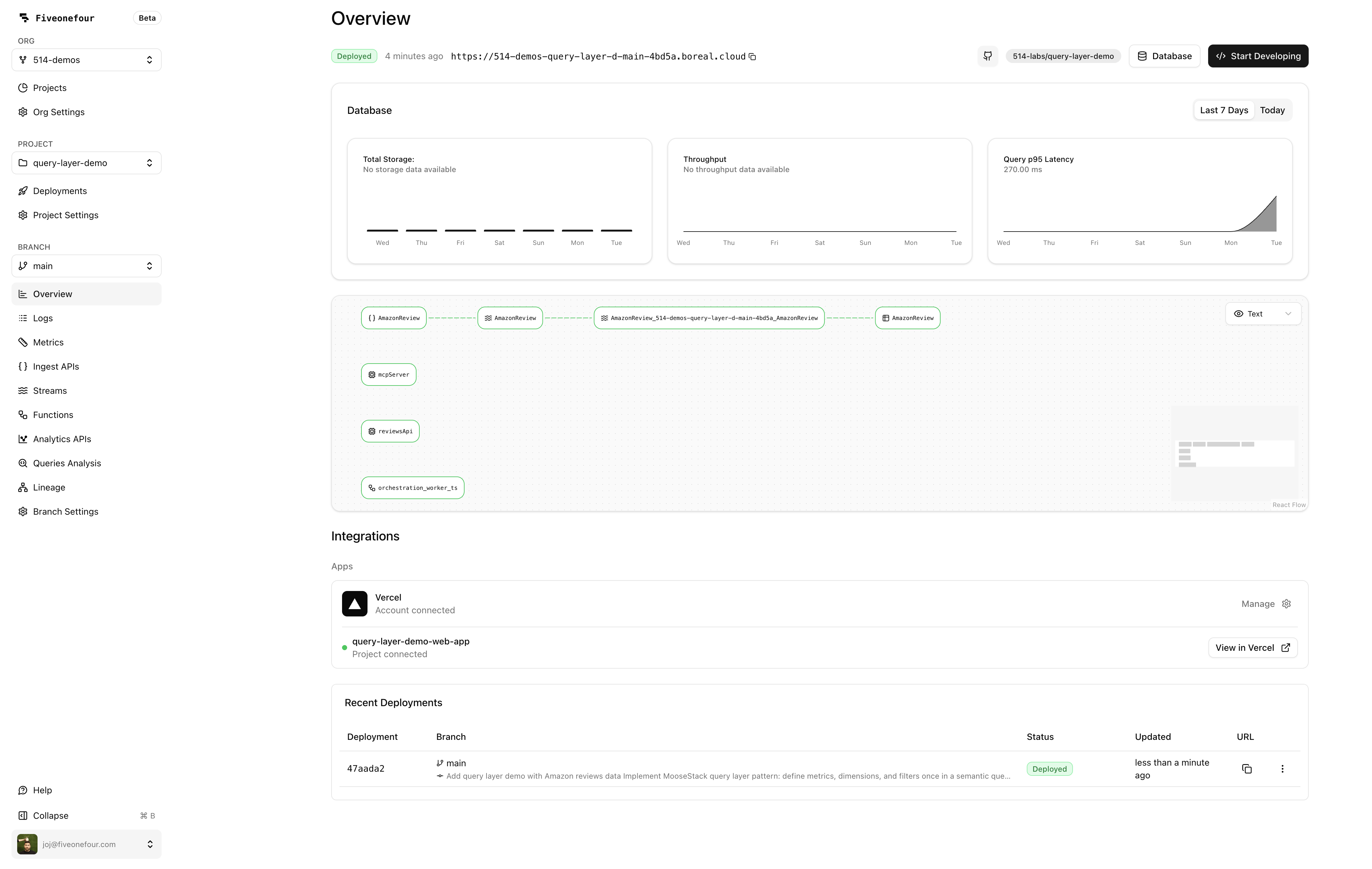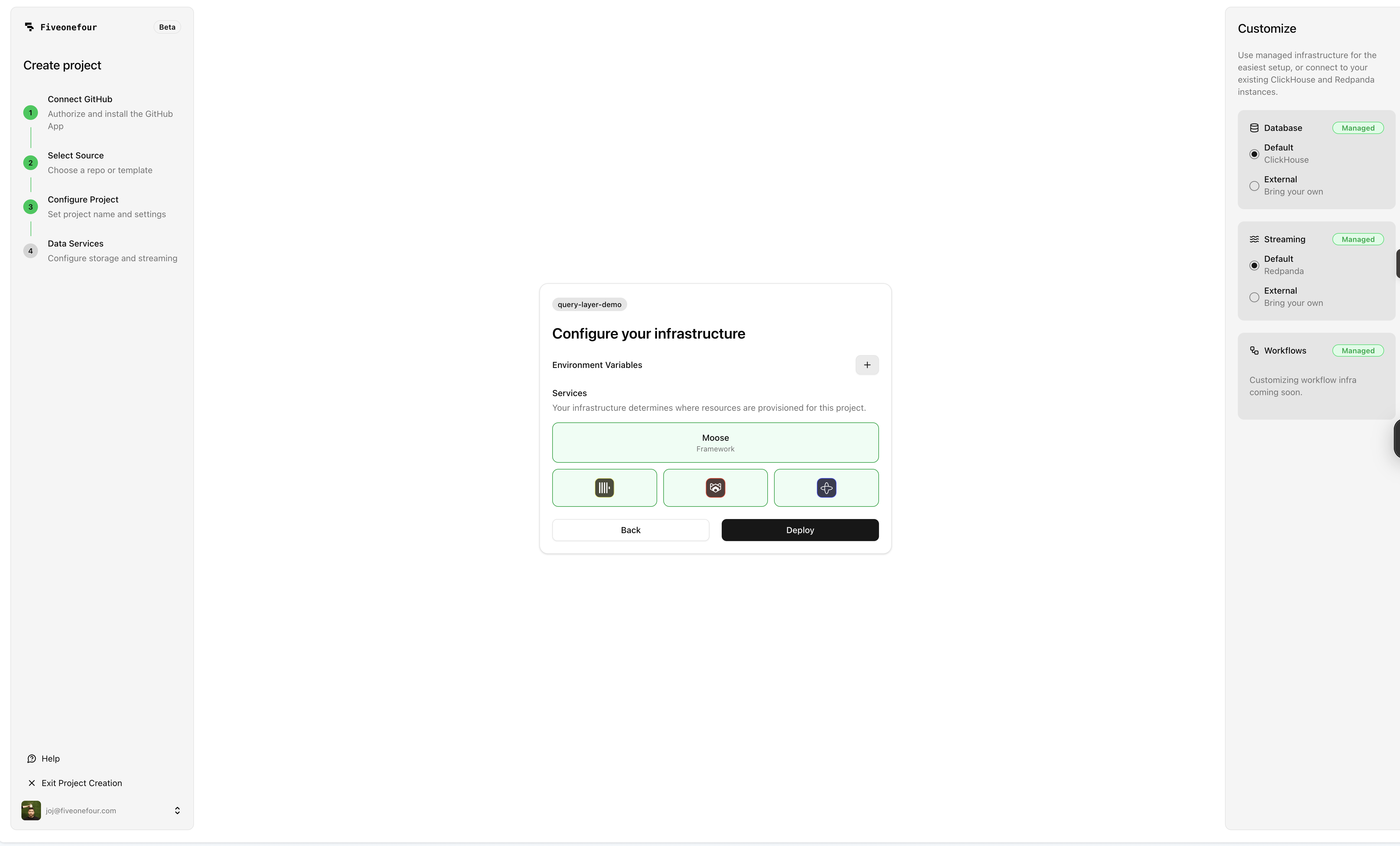 Everything is code: your data models, query layer, MCP tools, and chat configuration all live in your repo, go through PR review, and deploy through your normal CI/CD pipeline. With MooseStack, you iterate locally against a real ClickHouse instance, then deploy to Fiveonefour when you're ready to ship.