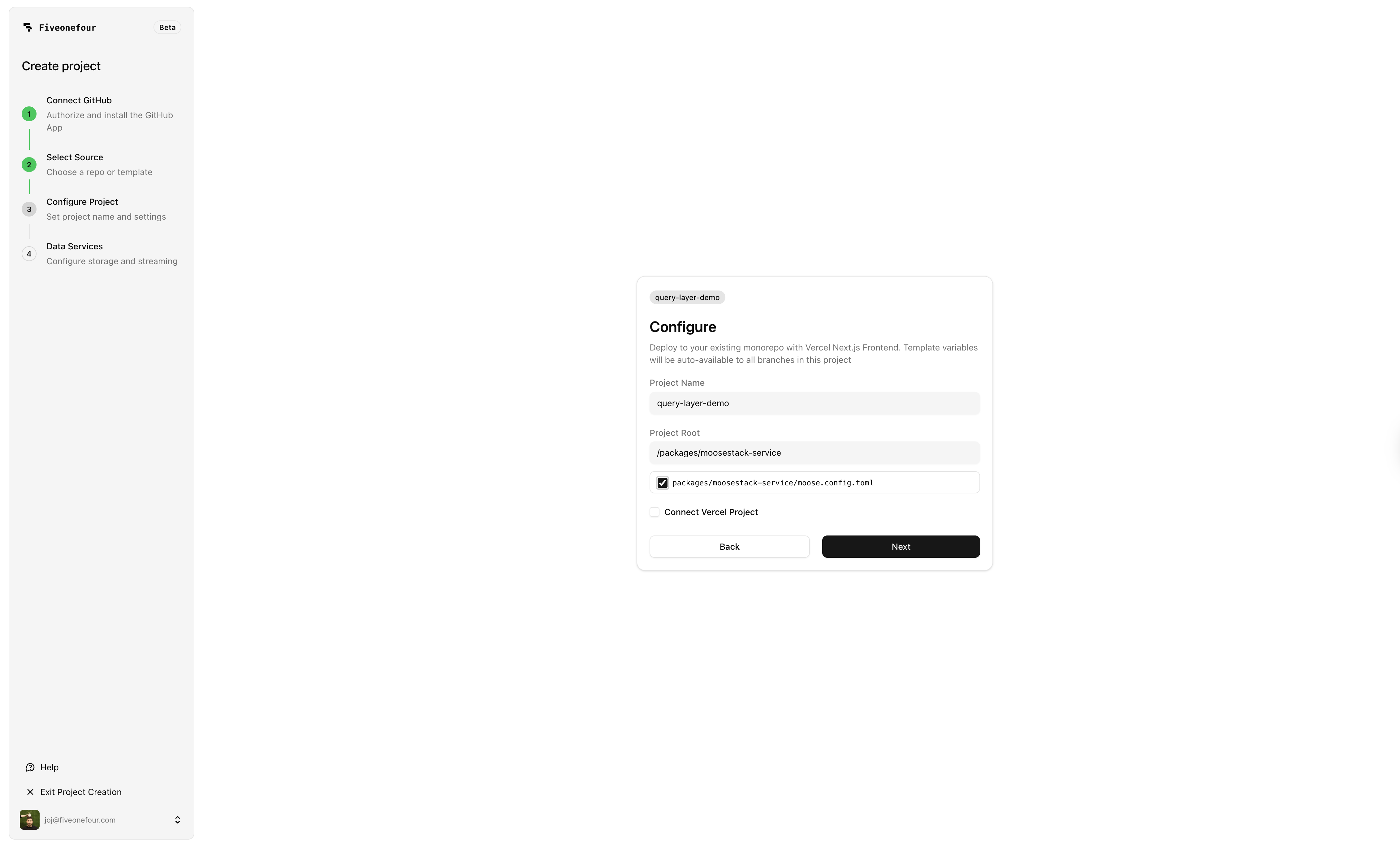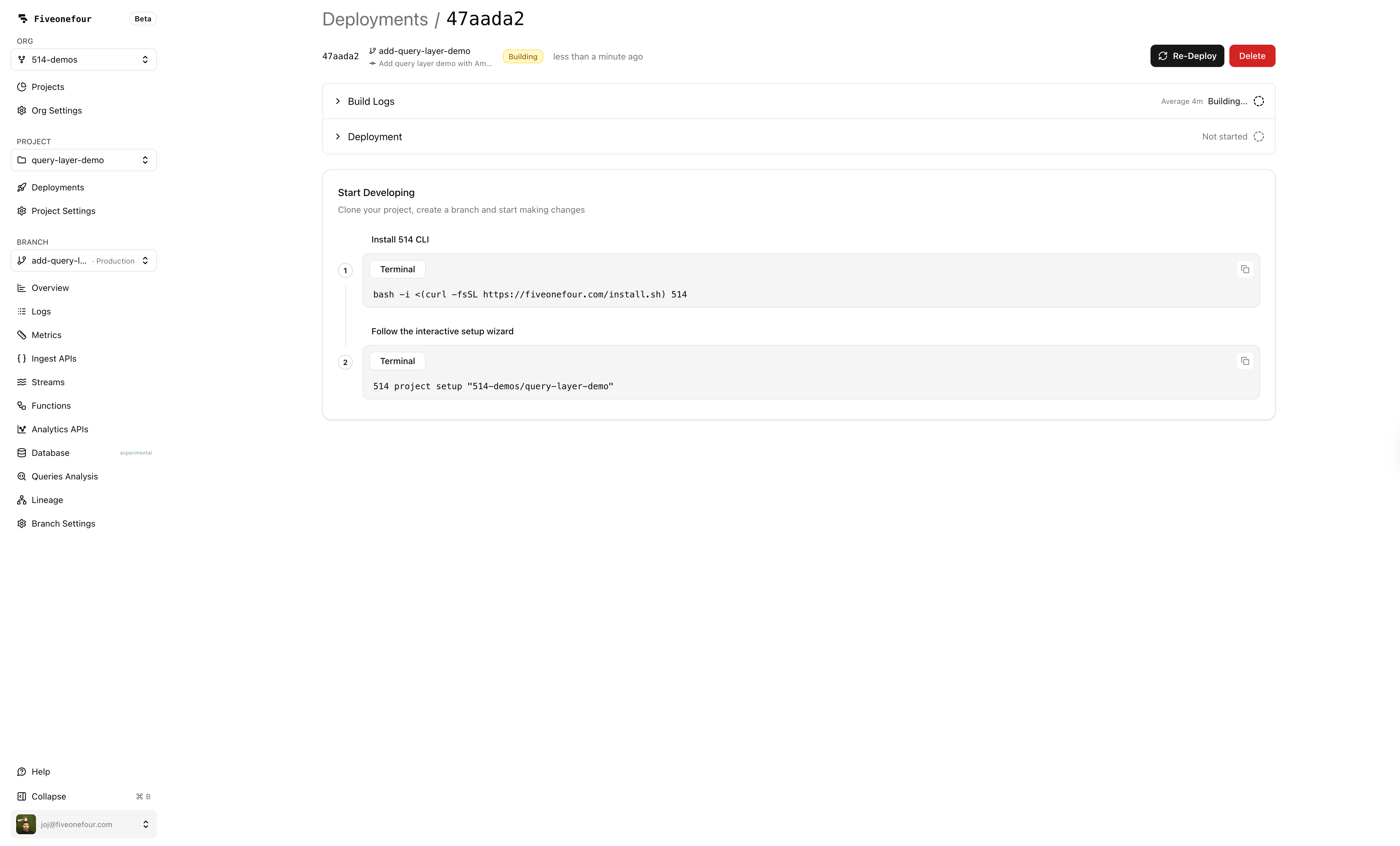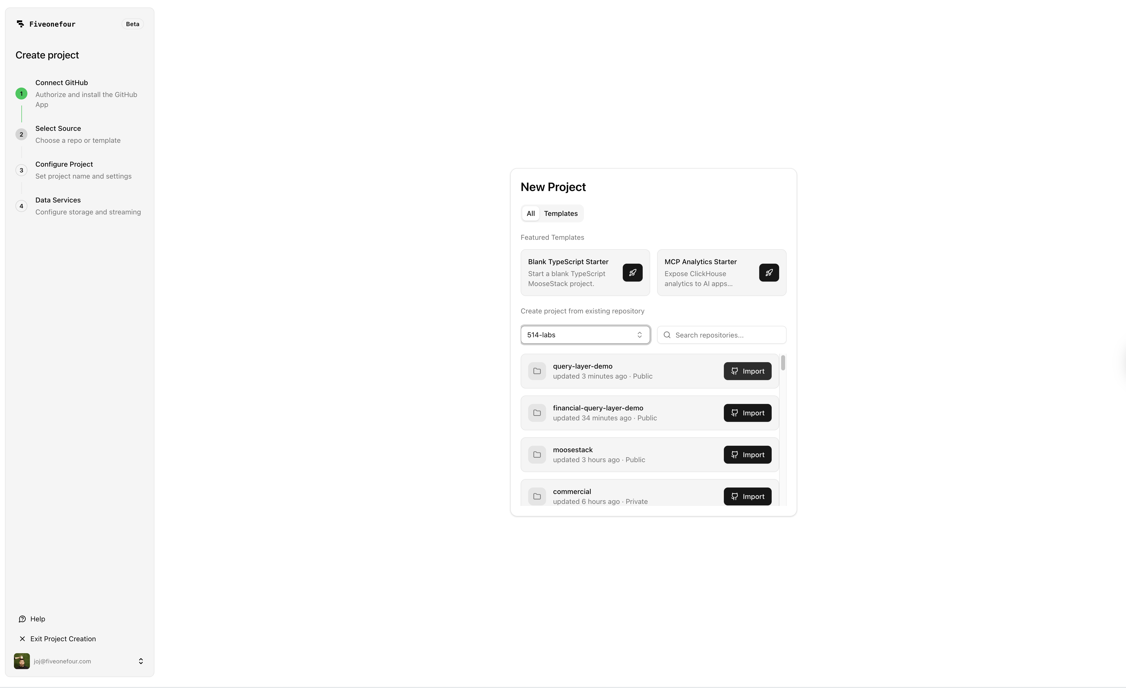 Everything is code: your data models, query layer, MCP tools, and chat configuration all live in your repo, go through PR review, and deploy through your normal CI/CD pipeline. With MooseStack, you iterate locally against a real ClickHouse instance, then deploy to Fiveonefour when you're ready to ship.