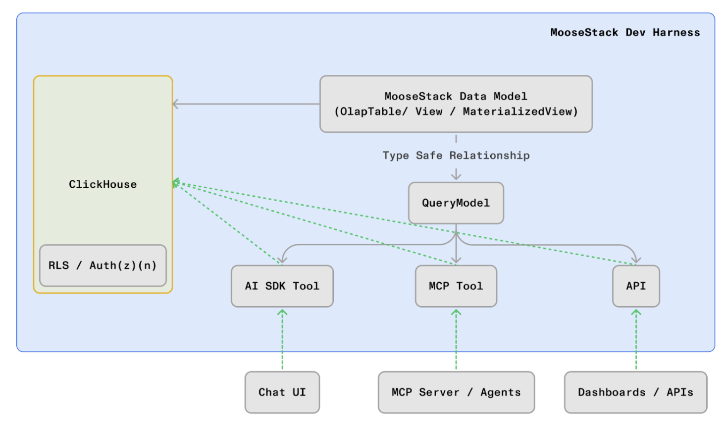 A MooseStack service exposing query_clickhouse and get_data_catalog tools, with bearer token authentication.