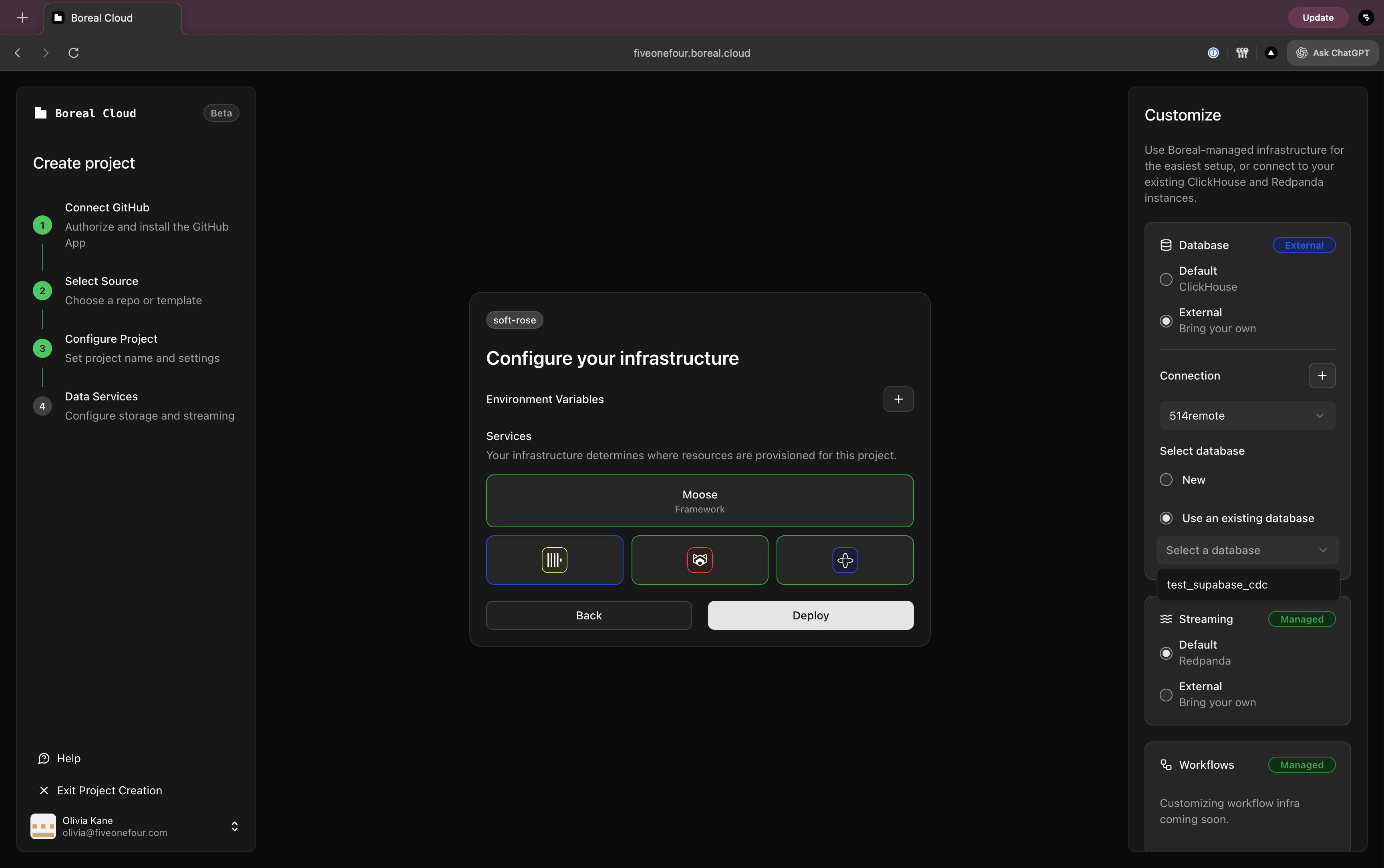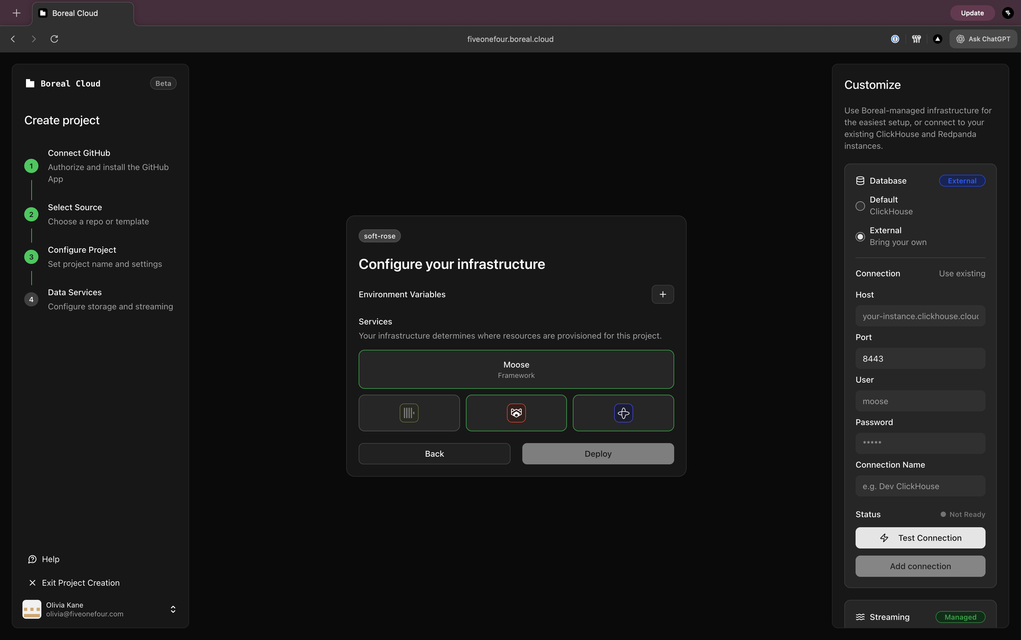This sets up the foundation for the rest of this guide. You'll initialize a MooseStack project in your monorepo and deploy your new project to Fiveonefour hosting for preview deployments and migration planning.